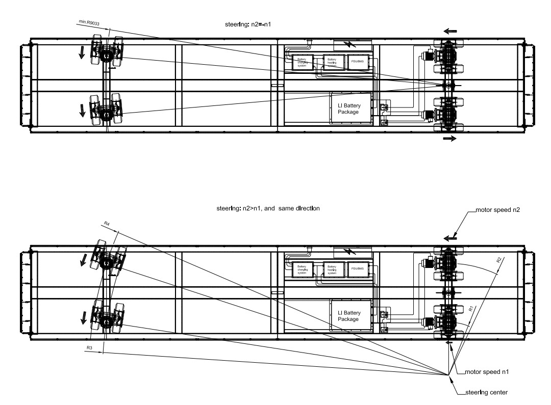 Управление с джойстикового р/пульта+резервный п/у на кабеле (предусмотреть возможность подачи гудка с обоих пультов в случае опасности на пути следования тележки)